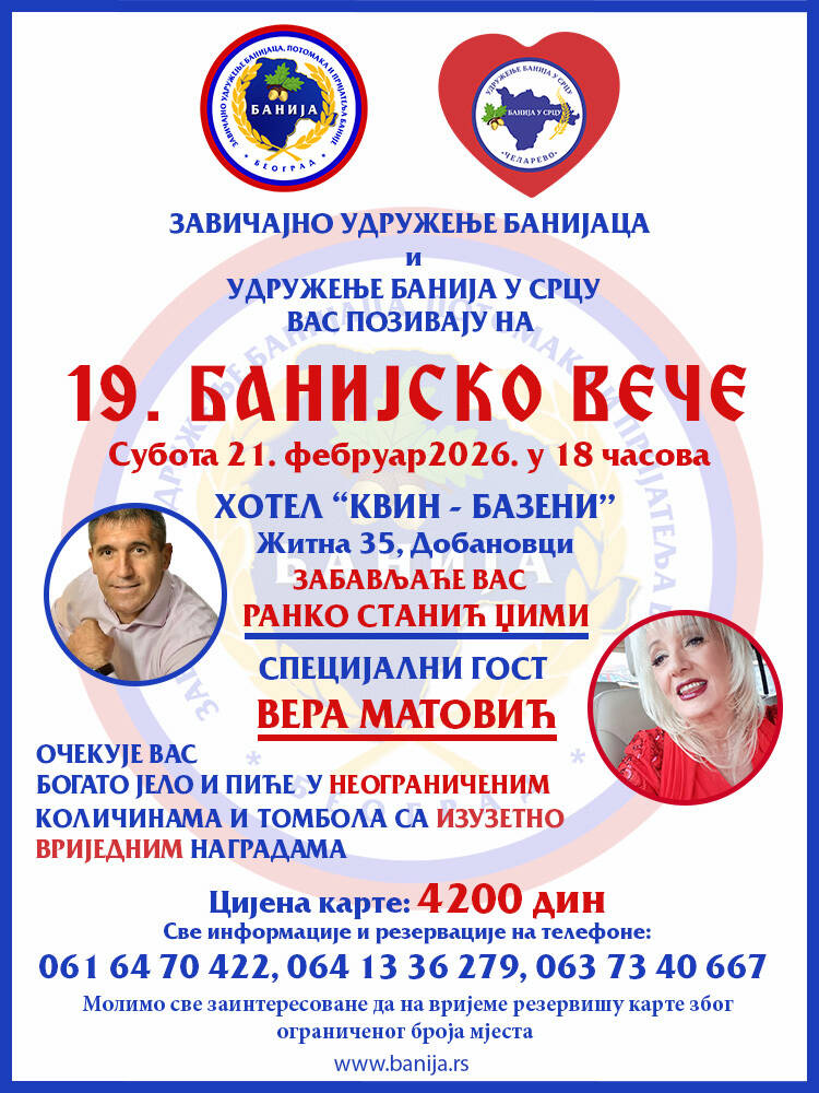 TRADICIONALNO BANIJSKO VEČE SA DŽIMIJEM STANIĆEM I VEROM MATOVIĆ