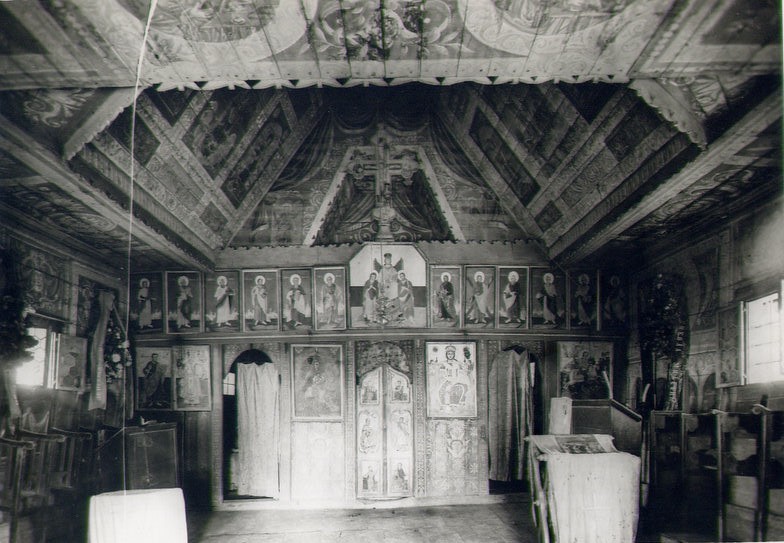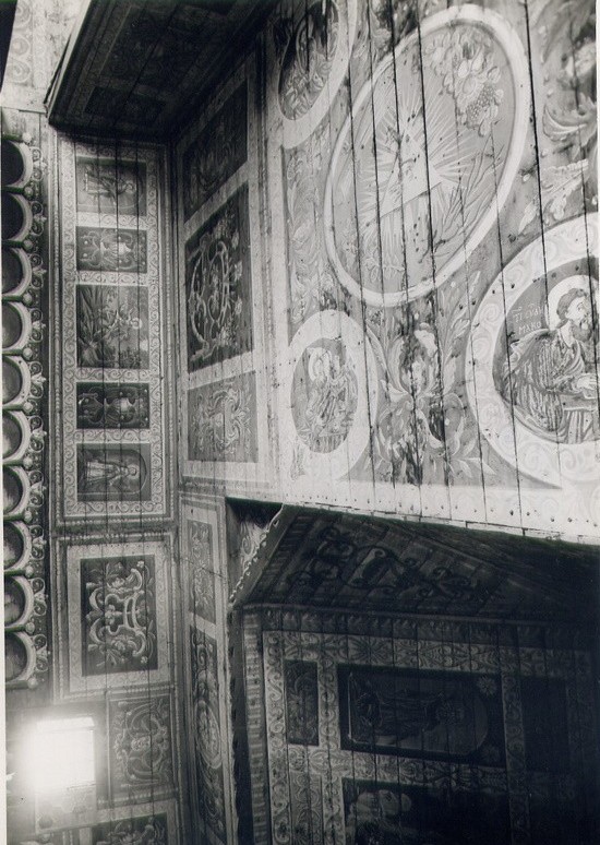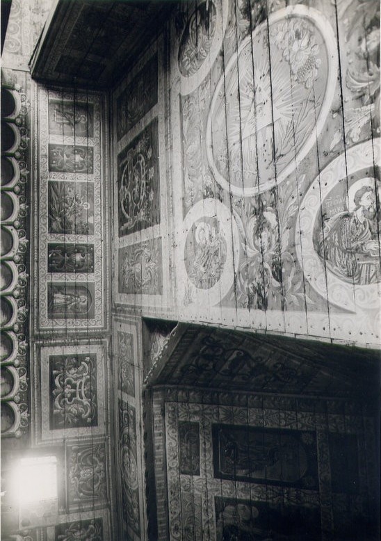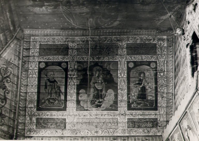U unutrašnjosti drvenih baroknih crkva najčešće nailazimo na bogato oblikovane enterijere. Takav je slučaj i sa crkvom u Hajtiću koja odlično pokazuje to oblikovno dvojstvo. Sa jedne strane vidimo jednostavnu arhitektonsku konstrukciju i oblikovanje masa osnovnim geometrijskim volumenima, a sa druge strane unutrašnji je prostor prezasićen raskošno oblikovanim baroknim inventarom. O inventaru i slikanoj dekoraciji u crkvi sv. Nikole u Hajtiću moguće je govoriti jedino na osnovu sačuvanih fotografija u zbirci Artura Šnajdera. Ulaskom u unutrašnji prostor crkve primjećuje se dosledno sprovedena ideja organskog jedinstva drvene rezbarije i slikane dekoracije što je inače odlika baroka koji time nastoji da snažnije djeluje na čula posmatrača. Precizno obrađena rezbarija konstruktivnih i dekorativnih arhitektonskih elemenata te crkveni mobilijar imaju na svojim površinama bogato slikanu dekoraciju. Na ravnom svodu priprate nalazi se naslikana vaza sa cvijećem i razigrana vreža vegetabilnog ornamenta. Na drvenoj pregradi između priprate i naosa naslikane su figuralne kompozicije, od čega se na fotografiji vide samo neke. Jedna, koja se zbog oštećenosti ne može identifikovati nalazi se na arhivolti iznad ulaza u naos. Lijevo od nje naslikana je kompozicija Krštonja, a desno sv. Georgije ubija aždaju. Obje kompozicije posjeduju viticama bogato oslikane okvire. Ispod Krštenja je ikona Bogorodice, a ispod sv. Georgija ikona sv.Jovana? Na plohama naosa i oplati svoda, pored bogato oslikanih vegetabilnih ornamenata i glava heruvima, nalaze se i figuralne kompozicije. Cjelokupna ornamentika djeluje preobilno i kićeno. Izvedena je tehnički precizno i formalno savršeno. Dio te dekoracije u kojoj su vegetabilnom ornamentom uokvirene figuralne kompozicije i oslikane ostale slobodne površine, možemo pojmiti sa dvije fotografije već pomenute zbirke. Na sjevernoj strani naosa, iznad drvenih stolica koje na gornjim završecima imaju bojom simuliran bogati dekor,